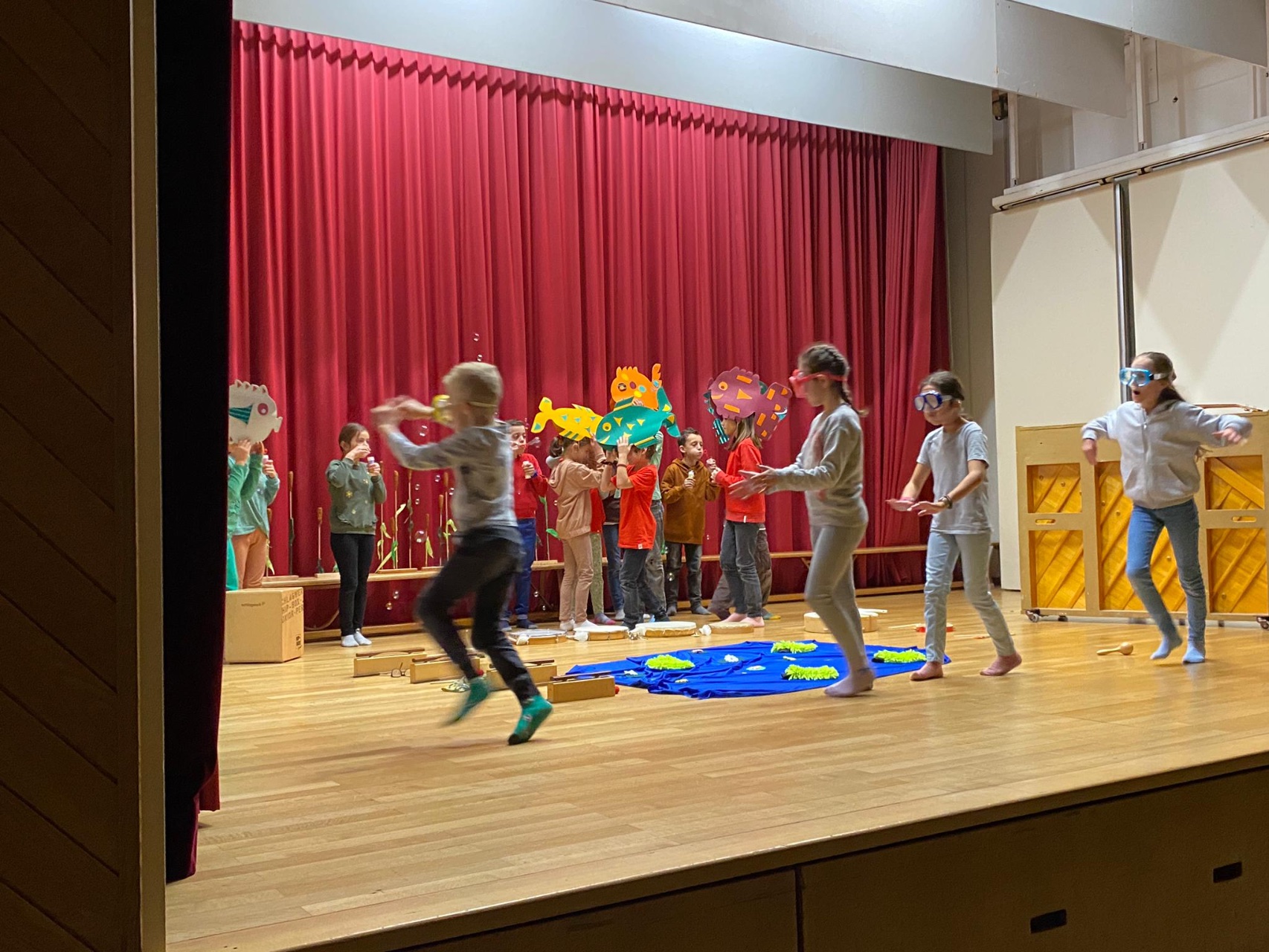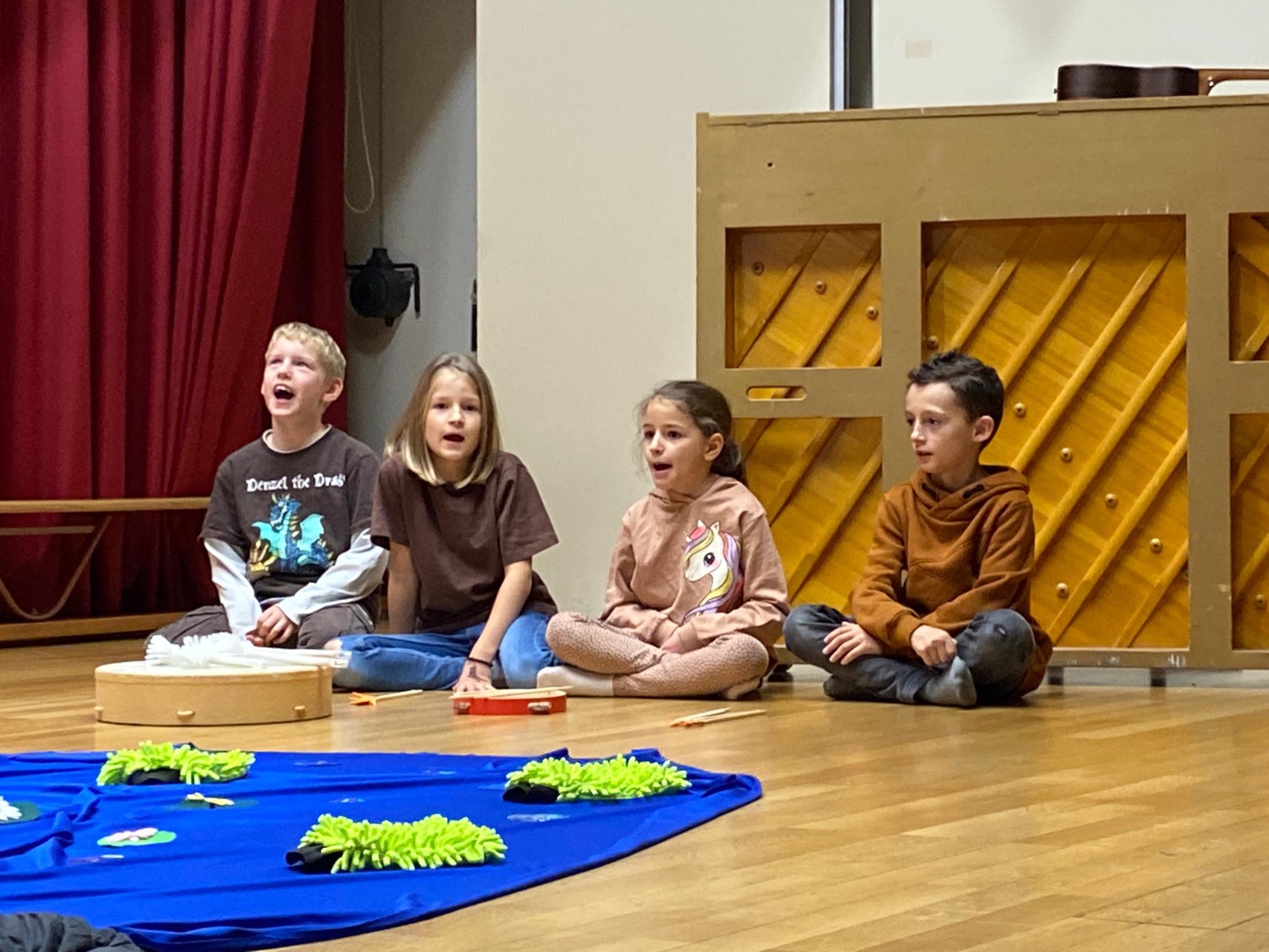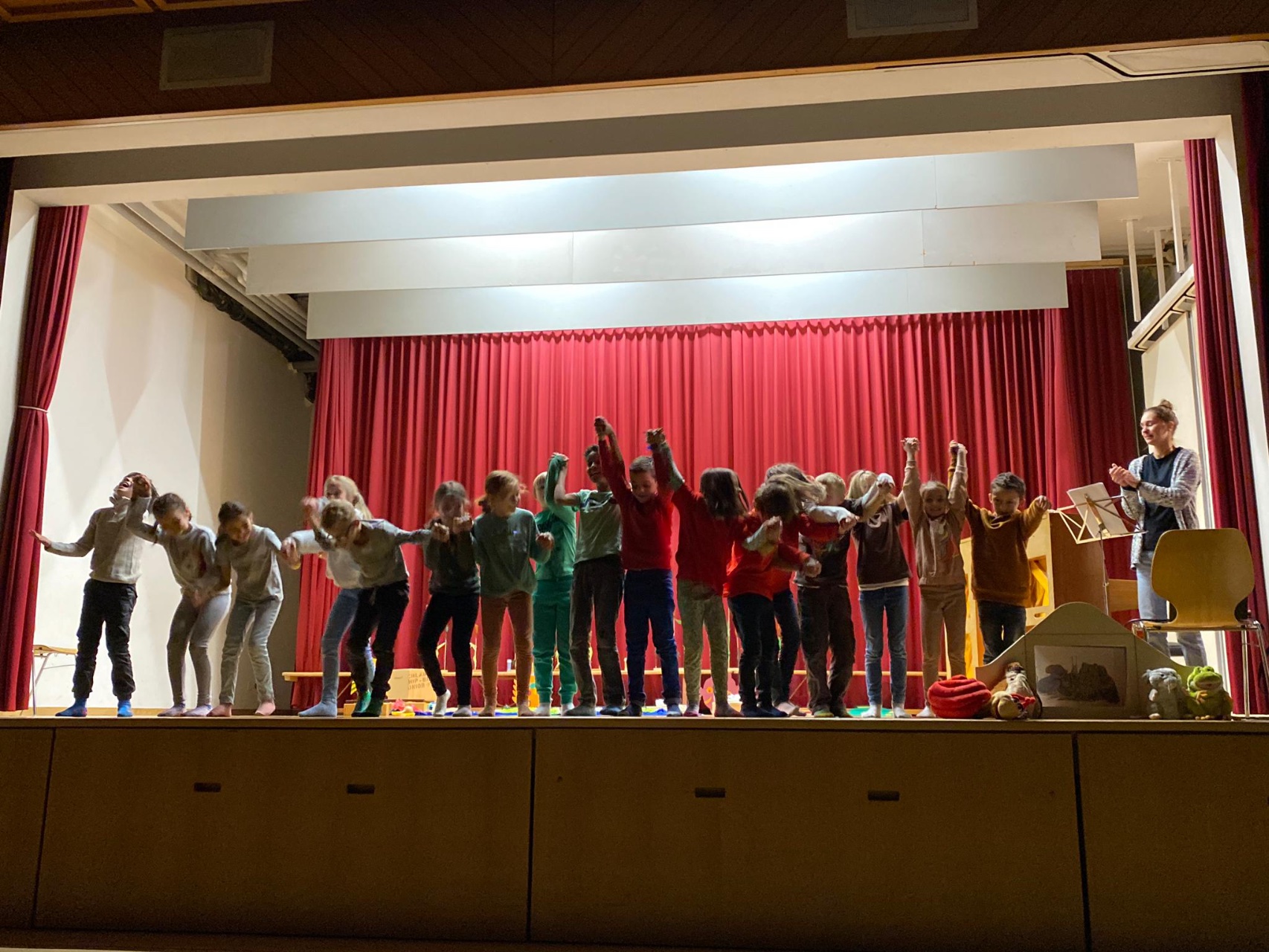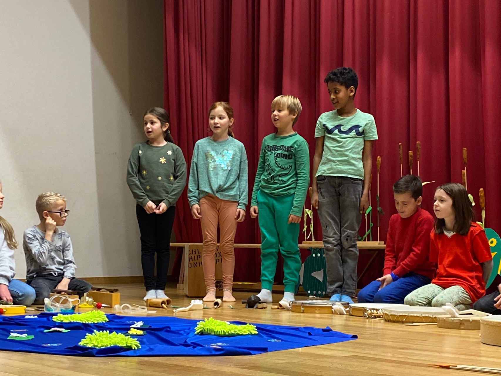 Die Klasse 2c studierte das Bilderbuch «Mutig, mutig» von Lorenz Pauli und Kathrin Schärer als Musical ein. Die Kinder sangen und musizierten zur Geschichte. Nach einer langen und intensiven Übungsphase führten sie das Musical vor grossem Publikum auf. Die Zuschauer staunten über den grossen Mut der Kinder, das Musical vor etwa 70 Zuschauern vorzuführen. Die Aufführung endete mit einem zufriedenem Lachen auf dem Gesicht aller Musicaldarsteller und Zuschauer.