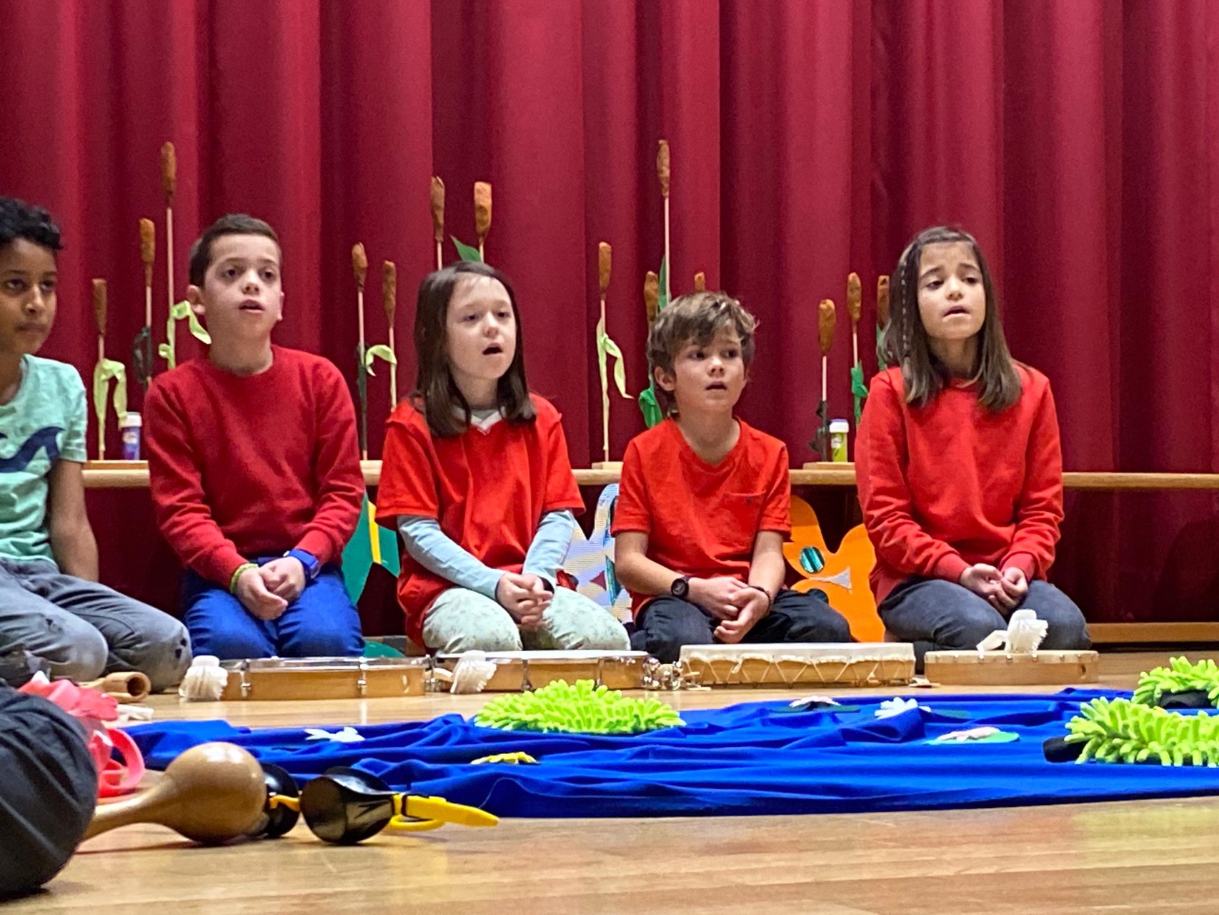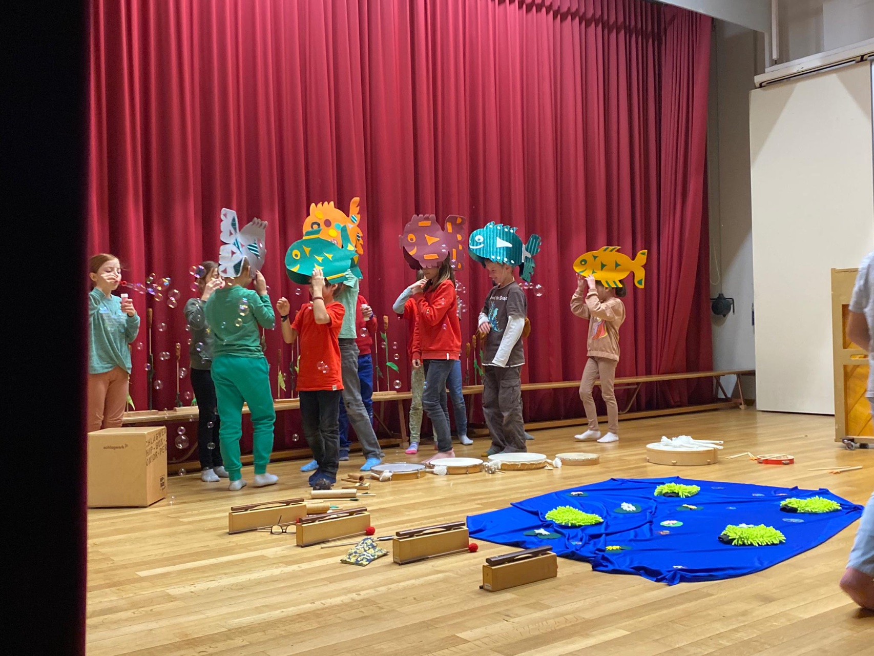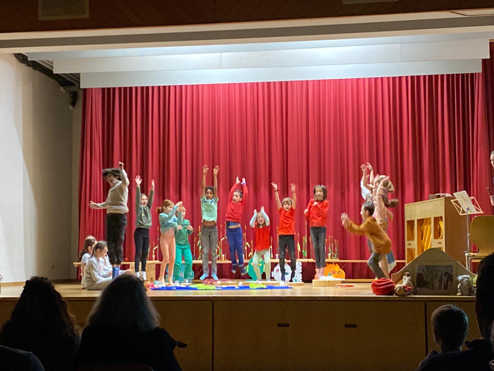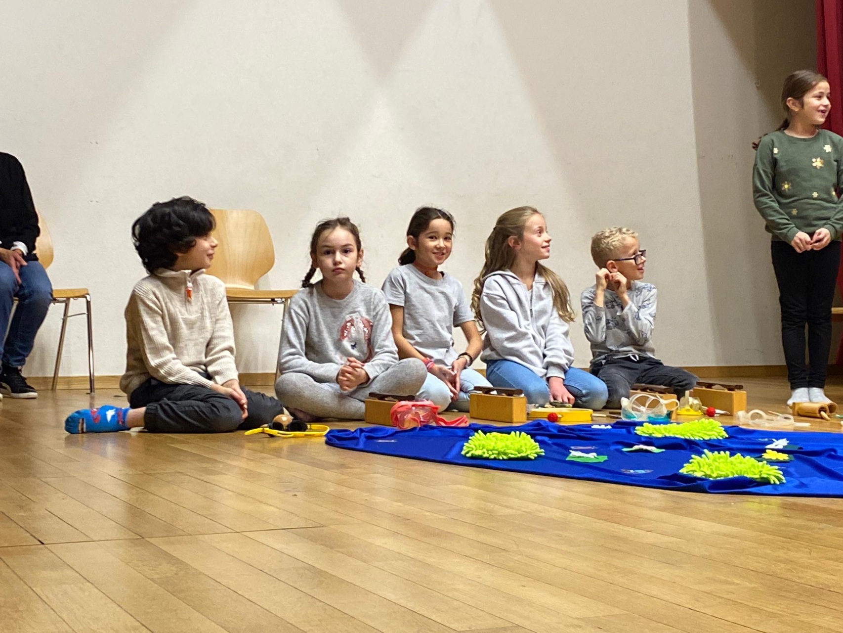 Die Klasse 2c studierte das Bilderbuch «Mutig, mutig» von Lorenz Pauli und Kathrin Schärer als Musical ein. Die Kinder sangen und musizierten zur Geschichte. Nach einer langen und intensiven Übungsphase führten sie das Musical vor grossem Publikum auf. Die Zuschauer staunten über den grossen Mut der Kinder, das Musical vor etwa 70 Zuschauern vorzuführen. Die Aufführung endete mit einem zufriedenem Lachen auf dem Gesicht aller Musicaldarsteller und Zuschauer.